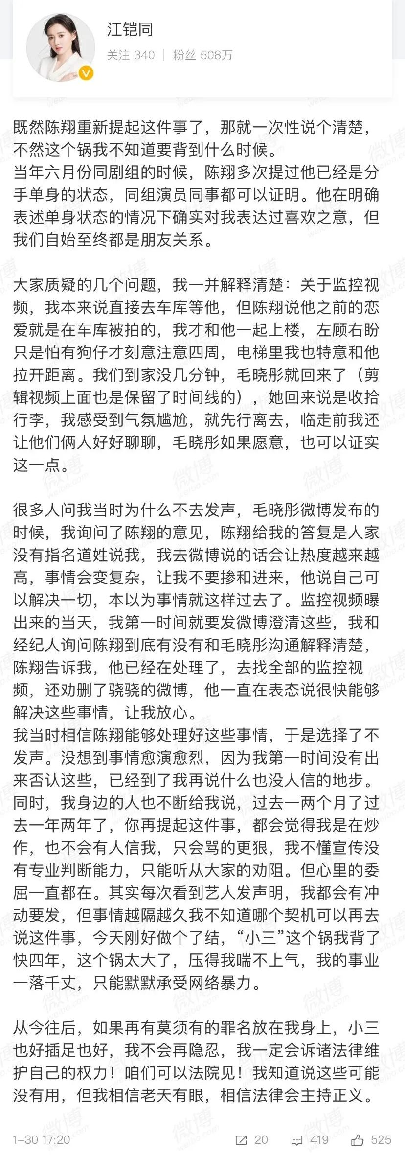尤其是当江铠同配合着发了长文,也不知道是没商量好,还是她内心也有气,上来就说6月份在剧组的时候陈翔已经多次提过自己是分手单身的状况,还明确对她表达过喜欢之意。