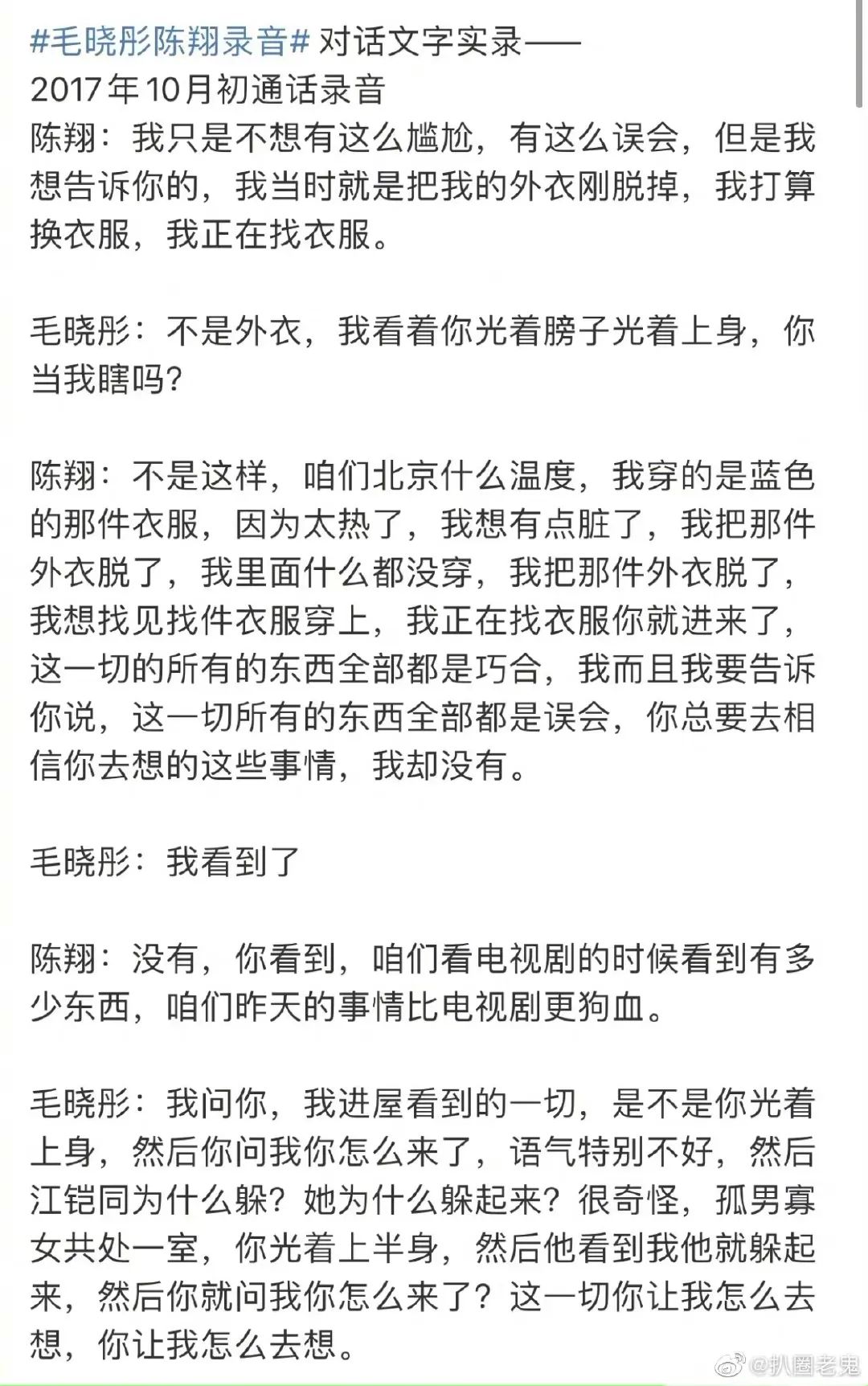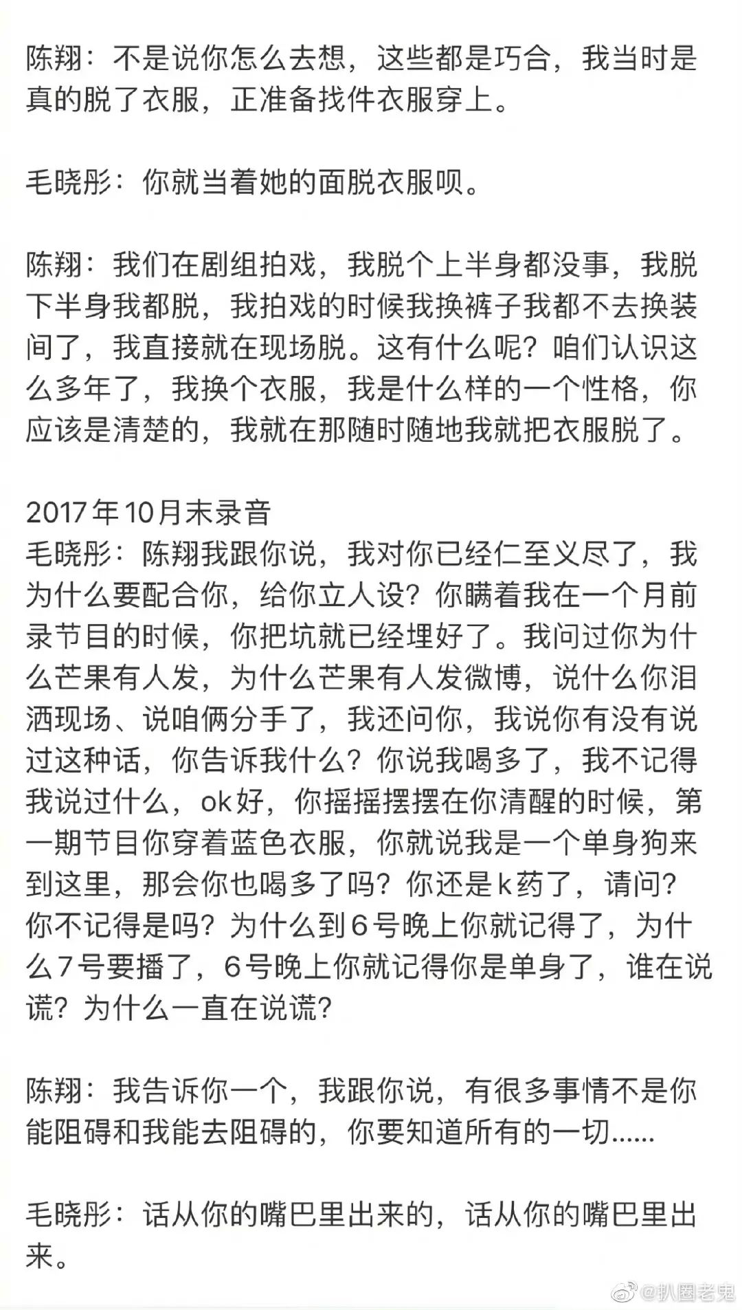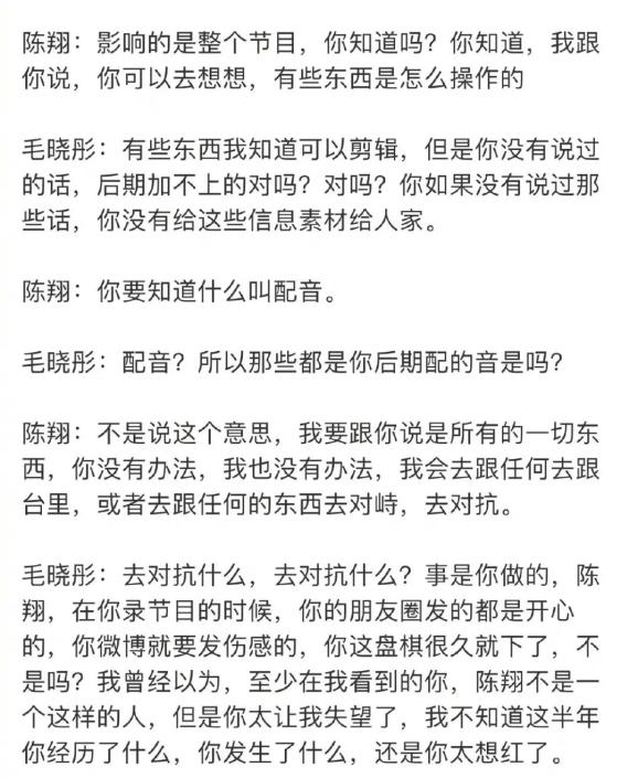 录音文字版本。图源水印另外一段时间2017年10月末毛晓彤质问陈翔为什么在综艺上说自己是单身。