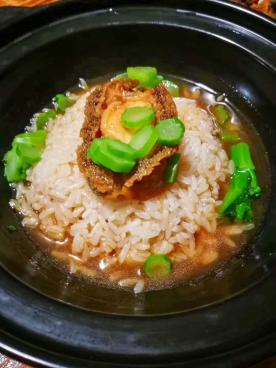 这道菜在平淡中见功夫。粒粒分明的米饭吸收了鲍鱼的鲜味,入口绵柔,甘而不腻,鲜味充盈在整个口腔中,让人久久回味。