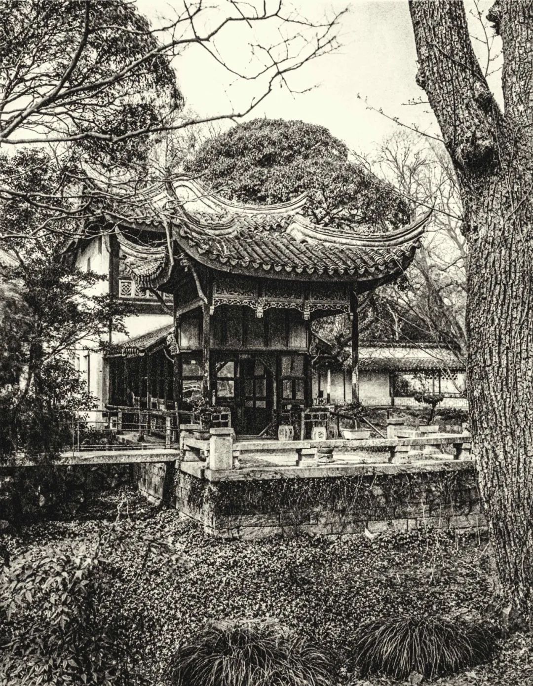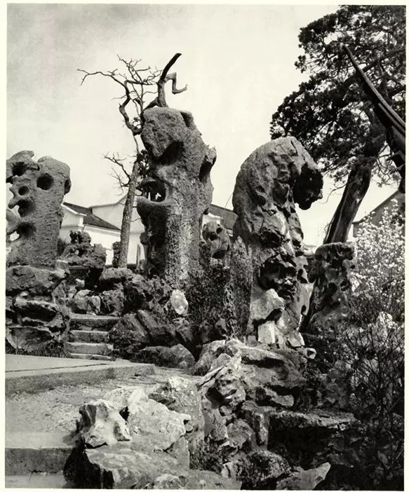 ▲(狮子林)入口处一株高大光秃的树。包爱兰:《中国园林览胜:留园与狮子林》,纽约,1943 年。这座园林在历史上可能经过不止一次的改造或修葺,因为这里的石头相比其他苏州园林,造型更为夸张。这样一来,整个地面就像一座小山,流水、古树环绕,光影交织形成特殊的装饰效果,这一特点在倪瓒的著名画作《狮子林图》中得以重点体现。这幅画因其中有大量题款,几乎已经成为历史文献。从画中内容来看,这座园林最初可能还种了竹子和多种乔木,繁茂的枝叶在低矮的茅屋和静思亭上方舒展。石头、树木和建筑的比例与现在大不相同,如今的建筑已不需要在树下寻求保护,而是盖起了宽大的屋顶,像大伞一样撑在高空中。