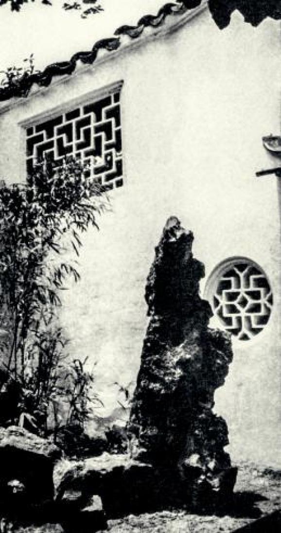 ▲(留园)一座袖珍庭院的湖石。熊形的湖石与圆形的花窗、南天竹雅致的枝叶与方形的花窗交相辉映。包爱兰:《中国园林览胜:留园与狮子园》,伦敦,1943年。