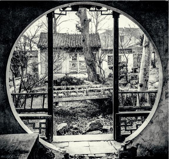 ▲(拙政园)位于拙政园旧址八旗会馆中的月洞门。喜仁龙:《中国园林》,纽约,1949 年。