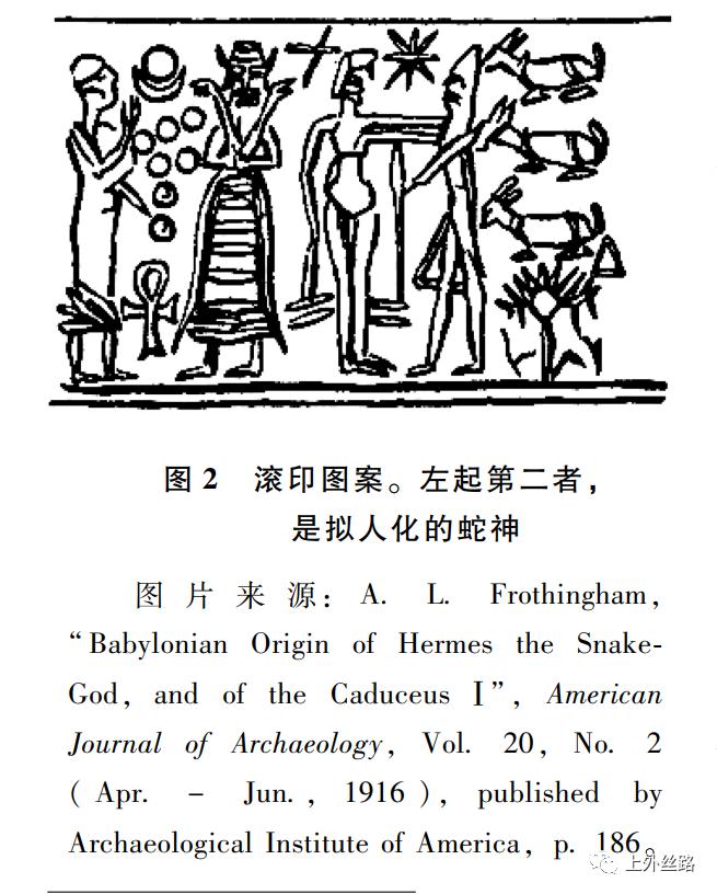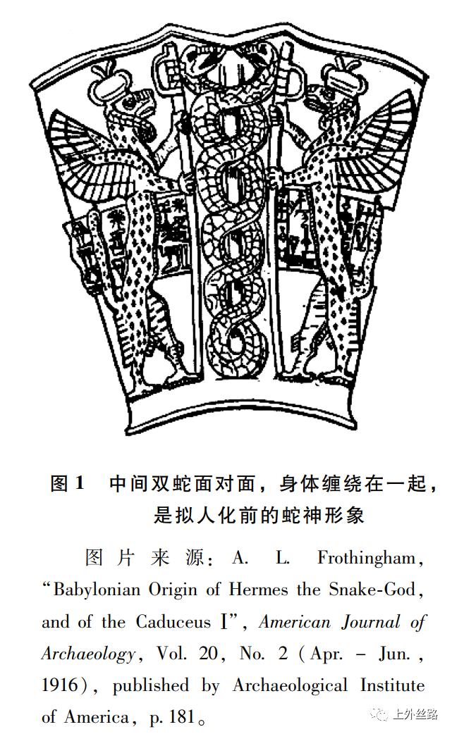 关于赫尔墨斯神的起源,早在一个世纪前就有学者做过深入探讨,认为赫尔墨斯来自苏美尔文明。20世纪,美国艺术史领域的著名教授符廷函(A.I Frothingham)撰写了一篇文章,他的文章标题赫然写着:《蛇神赫尔墨斯和蛇杖I:巴比伦起源》。文章写道:“原始赫尔墨斯一直被认为是蛇神,在完全拟人化时代之前,他的原始形态是蛇。”