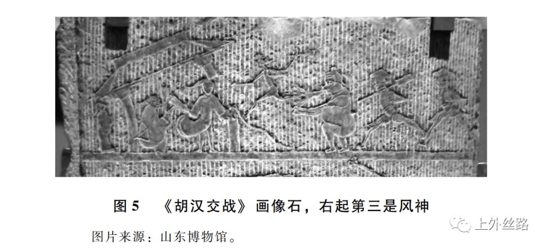 图5的画面富含古代伊朗宗教信仰的内容,或者不如说是反映了斯基泰/塞种人的宗教信仰。琐罗亚斯德阿维斯塔文献的第15部《祭祀》(Yast)有关于风神的不多的描写。目前仅能以《祭祀》的些许文字、学者的分析,以及主要依据画面所提供的图像逻辑而判断,图5右起第三个人形,应是风神瓦尤(Vayu),关于风神,可以依赖的文字描述以及考古实物都少得可怜。笔者认为,山东博物馆的《胡汉交战》画像石恰好可用来补充关于风神的传说。有文字可寻的关于风神的描述如下:“第52节以下风神被描述为死魔,他捆绑人,带走人。第54节形容他具备人形,但也只是勾勒出他的线条:他的臀部肥硕,胸部宽大。而眼睛凶残。”《胡汉交战》画像石上的风神,其臀部硕大、大腹便便是显而易见的,似乎眼睛也是突出的。这与上述阿维斯塔寥寥几笔的描述恰好吻合。风神在原始文献的一些段落中又被视作天和地狱的统治者,是战神。