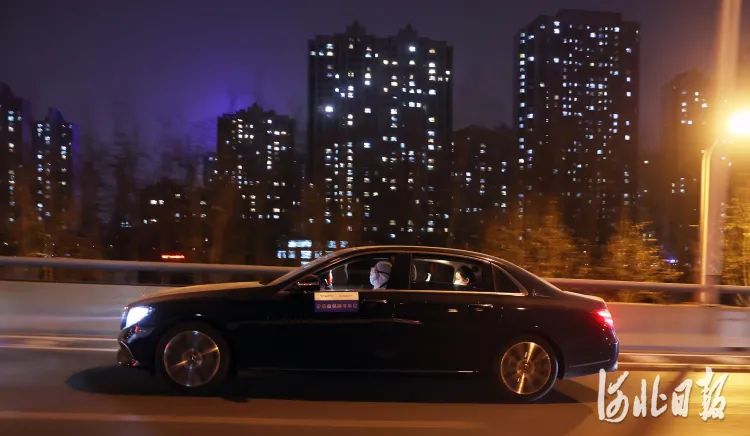 1月13日晚,应急保障车队队员载着归家心切的返石大学生,行驶在石家庄市南二环高架桥上。