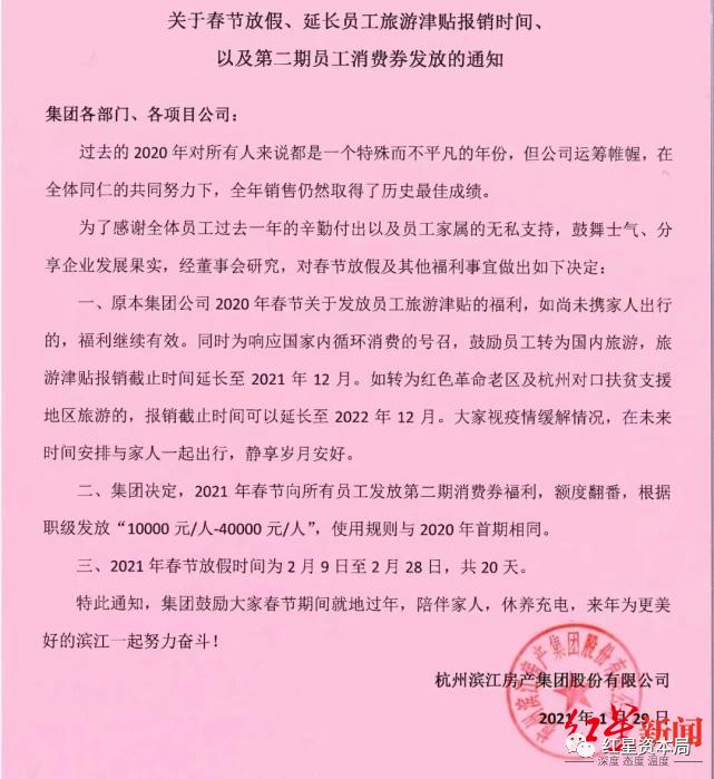 继2020年成功“伤害朋友圈”之后,今年来自杭州的滨江集团(002244.SZ)又成了意料之中幸福感最强的房企,宣布春节放假整整20天!这还没完,滨江集团还要在正常的年终奖之外,额外发放1万-4万元的消费券福利。