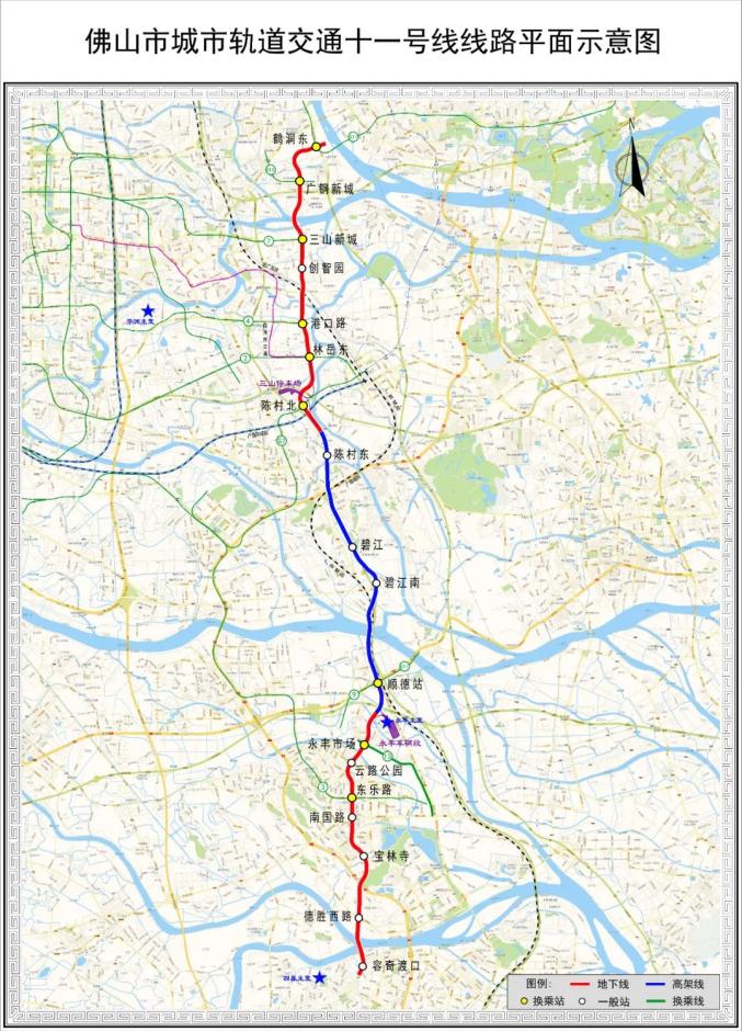11号线(容奇渡口站—鹤洞东站)长36.3公里,其中地下线24.3公里,高架线12.0公里;其中佛山段长约31.3公里,广州段长约5公里;设站18座,其中佛山段设站16座,广州段设站2座;投资估算260.64亿元,其中佛山段约224.69亿元,广州段约35.95亿元。最高设计速度100km/h,系统制式采用6辆编组B型车系统。项目主要联系大良容桂副中心、北滘陈村组团、三龙湾高端创新集聚区、广州广钢新城等重要城市发展区,将促进广佛“1+4”高质量融合发展试验区建设,强化佛山与广州快速联系,加快广佛同城化建设。