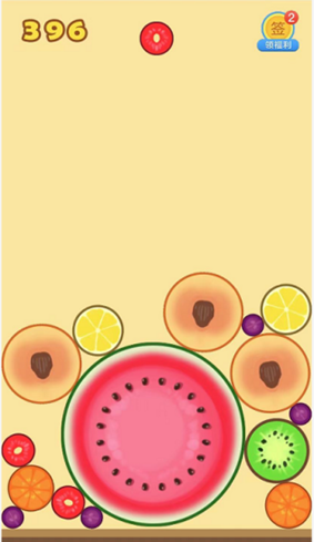 游戏的规则很简单:随机的水果从上方掉落,相同的水果碰撞在一起,最终会合成一个大西瓜,你也可以理解为2048+俄罗斯方块+水果。