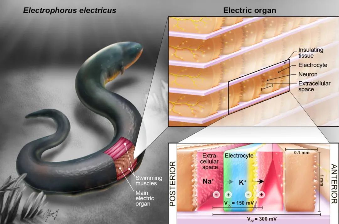 电鳗的每一个发电细胞可以发出大约0.15伏的电压,它全身总共约有5000-6000个发电细胞。当需要放电的时候,电鳗先对发电细胞进行充电,然后突然将所有的发电细胞进行串联,就能够瞬间释放出高达数百伏的电压了。
