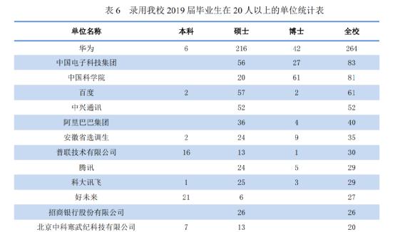 比如,中科大的毕业生,很多去了华为,一共264人,比紧随其后的中国电子科技集团、中科院和百度3家单位的总和还多。