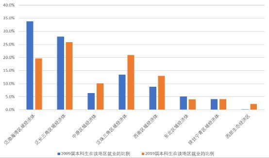 2009届、2019届本科毕业生就业地分布/数据来源:2010年、2020年就业蓝皮书上文说了,毕业生都会往经济发达地区走。10年前,泛渤海湾区域经济体(包括北京、天津、山东、河北、内蒙古、山西)正是辉煌时刻: