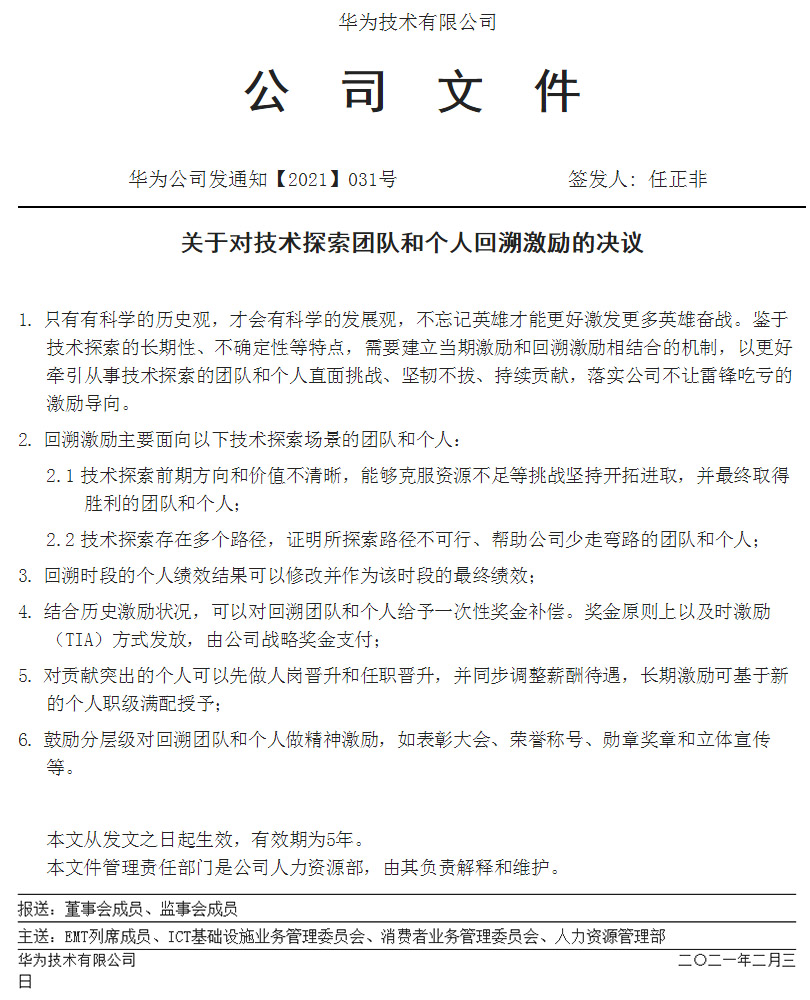 华为心声社区2月3日消息,华为技术有限公司创始人兼总裁任正非签发31号电邮文件《关于对技术探索团队和个人回溯激励的决议》。文件表示,华为要对做出历史贡献但没有得到相应激励的技术探索团队和个人进行回溯激励。