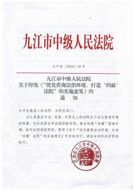全面优化营商法治环境。牢固树立“法治是最好的营商环境”理念,结合“营商环境优化年”和“迎国评”工作,出台《优化营商法治环境、打造“四最”法院工作意见》,联合省犯罪学研究会、市工商联召开优化法治化营商环境座谈研讨会,发布优化营商环境“十大典型案例”。湖口县法院审理的原告四达氟塑股份有限公司诉被告九江天赐高新材料有限公司买卖合同纠纷一案民事判决书,被评为全省商事审判服务保障优化营商环境十大优秀裁判文书。强化审慎善意文明的司法理念,加强产权司法保护。通过调解方式妥善化解原告江西赣基集团工程有限公司诉被告贺超群追偿权纠纷,依法保护了一批重点民营企业的合法权益。调整行政案件集中管辖法院,健全行政争议协调机制,推动行政机关负责人出庭应诉常态化和行政争议实质性化解。依法审结各类行政案件916件,全市行政机关负责人出庭应诉案件185件,同比上升55.46%。