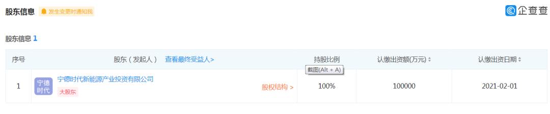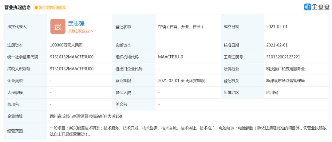 企查查显示,2月1日,宁德时代全资子公司成立成都市新津时代新能源科技有限公司,注册资本10亿元人民币,经营范围包含:新兴能源技术研发;技术服务、技术开发、技术咨询、技术交流、技术转让、技术推广;电池制造;电池销售。