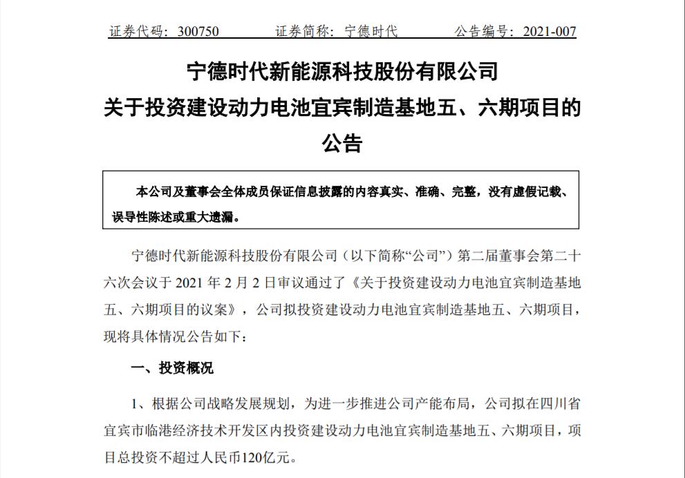 2月2日晚间,宁德时代公告称,拟合计斥资290亿元扩产或新建四川宜宾、广东肇庆、福建霞浦三个电池生产线项目。具体观之,公司拟在四川省宜宾市临港经济技术开发区内投资建设动力电池宜宾制造基地五、六期项目,项目总投资不超过120亿元;拟在广东省肇庆市投资建设宁德时代动力及储能电池肇庆项目(一期),项目总投资不超过120亿元。控股子公司时代一汽动力电池有限公司拟在福建省宁德市霞浦县投资建设时代一汽动力电池生产线扩建项目,项目总投资不超过50亿元。
