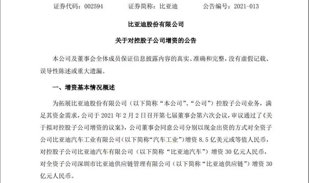 就在宁德时代宣布扩产的同日,另一家新能源汽车龙头比亚迪(002594)也公布了合计68.5亿元的增资计划。公告称,公司拟分别以现金的方式对全资子公司比亚迪汽车工业有限公司增资8.5亿美元或等值人民币,对控股子公司比亚迪汽车有限公司增资30亿元人民币,对全资子公司深圳市比亚迪供应链管理有限公司增资30亿元人民币,上述增资金额将分别全额计入子公司注册资本。比亚迪方面表示,上述增资乃根据公司正常生产经营的需要,有利于子公司更好地发展其业务。