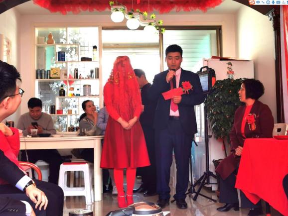 “今天是个好日子,心想的事儿都能成;今天是个好日子,打开了家门咱迎春风……”虽然在家中举办婚礼,场地不大,参加婚礼的人也就十多位,但喜庆的歌声绕梁,热闹的氛围不减。