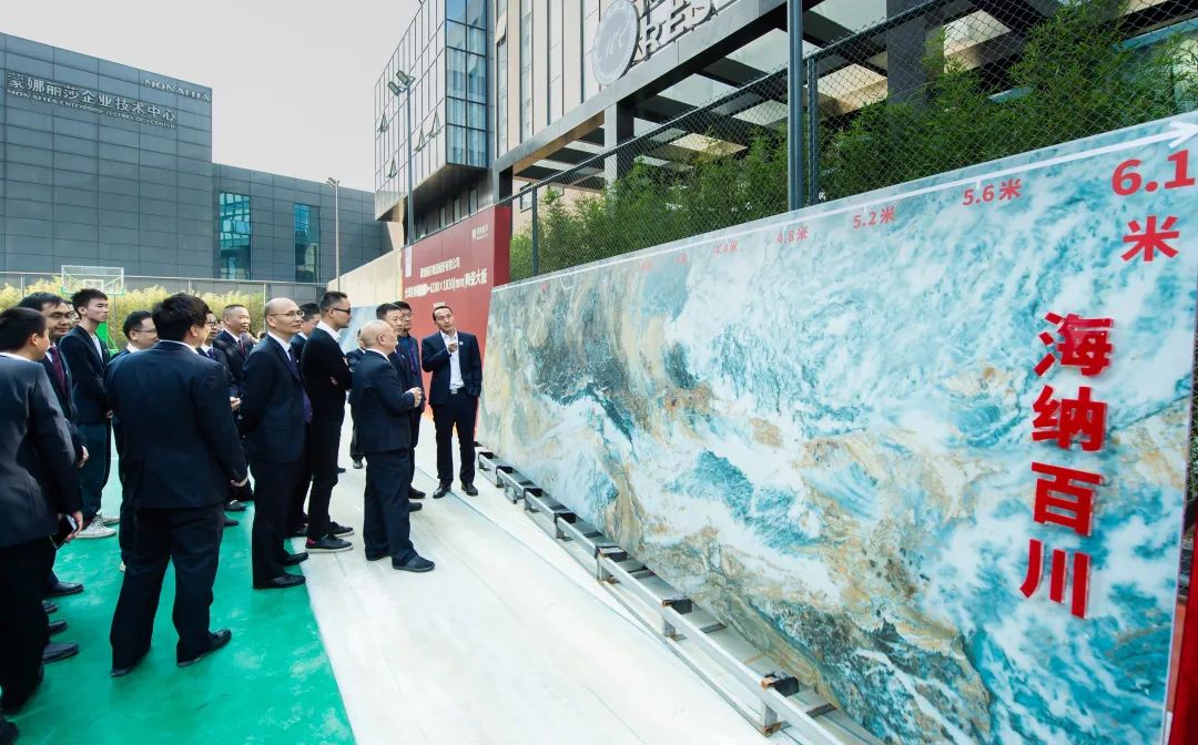 蒙娜丽莎从2015年上马亚洲首台一万吨压砖机,到2016年国产首台16800吨压砖机,再到国产首台36000吨压砖机,一步步冲破大规格陶瓷板生产的国际垄断,陶瓷岩板已能做到1600×3600mm。