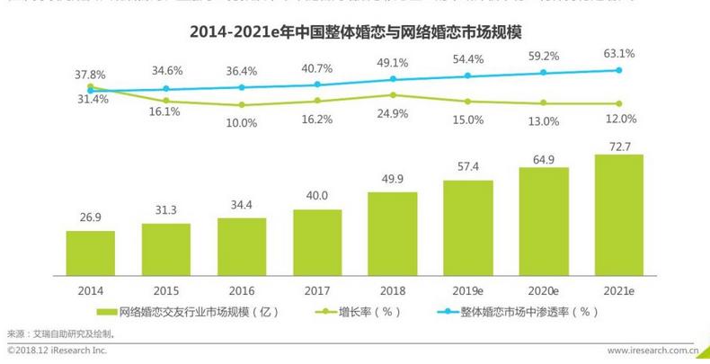 根据艾瑞咨询《2019年中国网络婚恋交友行业研究报告》显示,网络婚恋在整体婚恋市场的渗透率在持续增长,预计在2021年将会达到63.1%