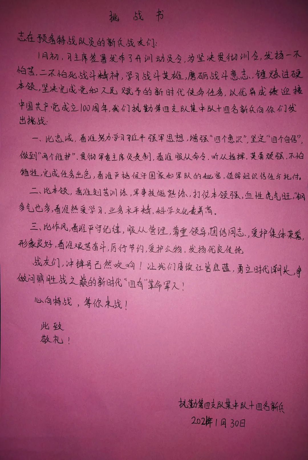 日子一天天过去,每天听着背后练兵场上的呼号声和喊杀声,本以为新战士们忙于训练,早已无暇顾及“挑战书”,但没想到刚吃完中午饭准备回办公室时,一位精气神十足的新同志,身影飞快地向我跑来,“梁干事,您好!这是我们中队14名新同志的挑战书,烦请您斧正指教……”接过他手里的“挑战书”时,思绪在那一瞬间有着些许激动与失神,激动于他们干事创业的精神与信念;激动于他们做事踏实,为了梦想砥砺前行的优秀品质。后来在与该同志的交流中了解到,他们一直都记得这个事情,为了完成“挑战书”的撰写,他们利用训练间隙与工作之余,抓住点滴时间学习、动笔、集体讨论,并请教中队骨干进行修改后才完成这封“战书”。