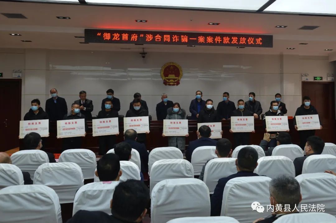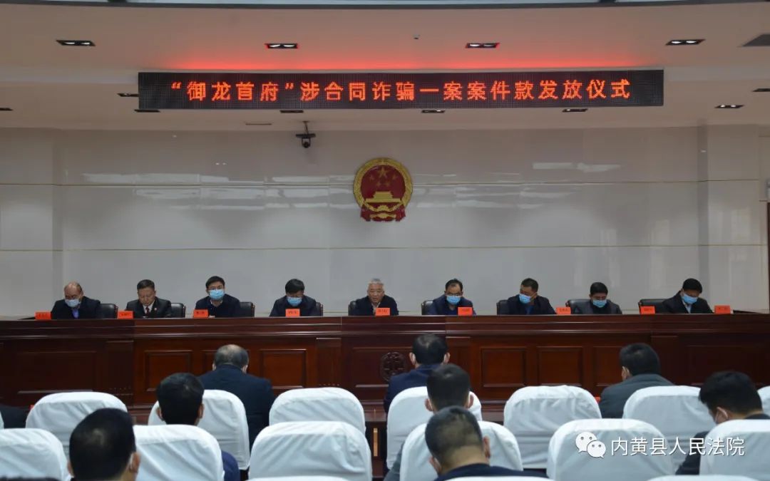 2021年1月28日下午,河南省安阳市内黄县法院在四楼会议室举行了“御龙首府”涉案合同诈骗一案案件款发放仪式,参加会议的有内黄县人大常委会主任裴喜拴,内黄县委常委、县纪委书记监委主任齐宏阳,内黄县委常委、政法委书记狄拥军,内黄县人大常委会副主任、总工会主席鉴洪君,内黄县副县长曹卫彬,内黄县政协副主席赵献力,内黄县检察院党组书记、代检察长焦琰,内黄县公安局党委书记、局长李景善,内黄县政法委副书记黄虹普,以及内黄县人大、政协、县检察院、县公安局领导和市县人大代表、县政协委员参加了本次仪式。仪式由该院党组书记、院长王海军主持。