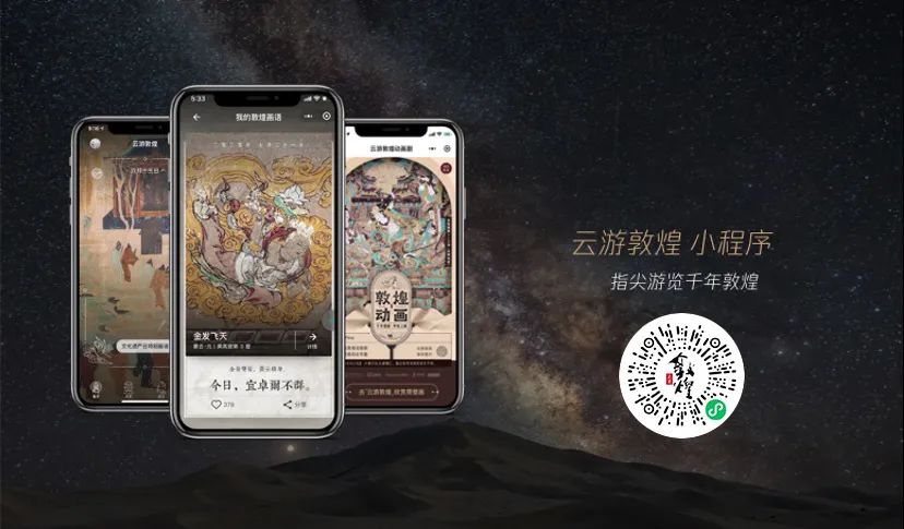 识别图中小程序码点亮莫高窟自2017年敦煌研究院与腾讯达成战略合作以来,双方一直积极推动敦煌文化的数字化传播,先后推出了数字供养人、王者荣耀飞天皮肤、QQ音乐“古乐重声”音乐会、“敦煌诗巾”创意小程序、“云游敦煌”小程序、敦煌动画剧等项目。其中,“云游敦煌”上线10日内总访问量即突破500万,其后在广受好评的“今日画语”基础上又陆续推出“敦煌动画剧”、“云采丝巾”等功能,并荣获由国家文物局主办的2020年度中华文物全媒体传播精品(新媒体)推介项目。