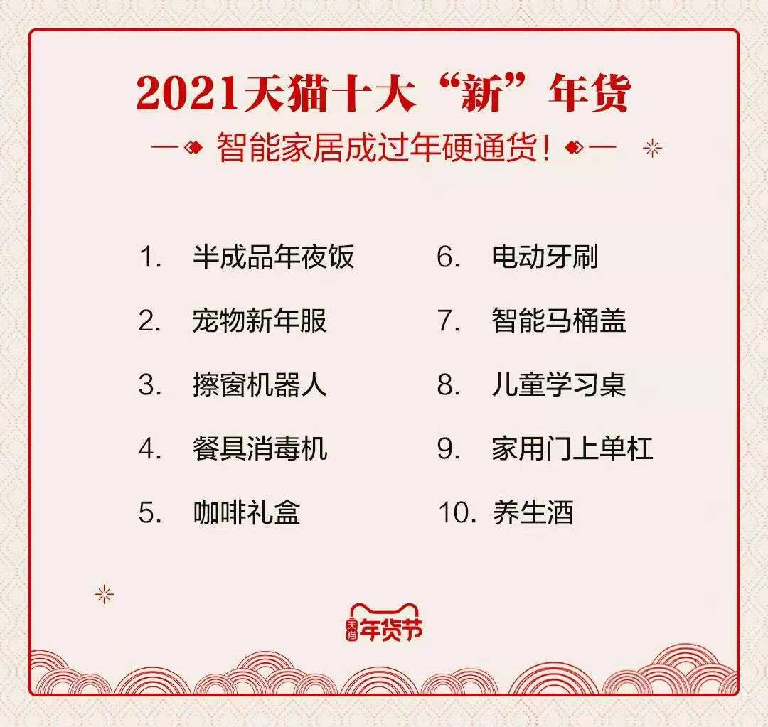 在天猫发布的2021十大“新”年货中,半成品年夜饭排名第一,宠物新年服排名第二,智能家居产品、健身产品也赫然在列。除了食品是亘古不变的新春必需品之外,中国人对运动健身、新科技、萌宠一类满足家庭生活需求的产品也呈现了明显的消费趋势。