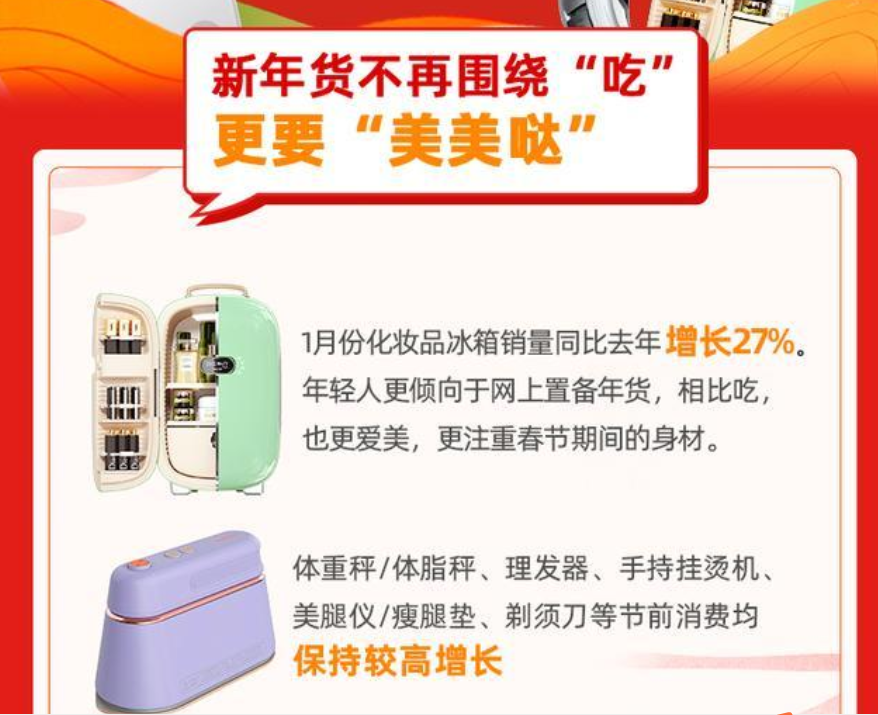 天猫消费电子《2021年新年货趋势报告》显示,今年年货节的用户普遍呈现出了对健康和美貌的追求,新趋势品类的增长较为明显。