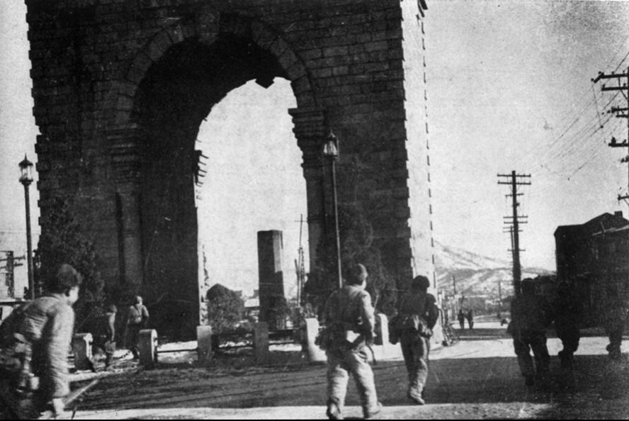 第五十军一部在汉城独立门搜索前进。图源:《战斗在朝鲜》(第五十军政治部1955年编印)