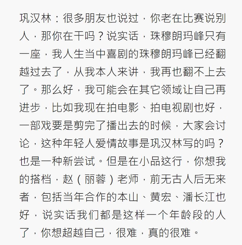 而《妈妈的今天》,也获得当年“我最喜爱的春晚节目评选语言类一等奖”。俩人在春晚一共表演过五个小品,最后一次是1999年的《老将出马》。赵丽蓉的创作精神,也一直影响着巩汉林。2010年之后,他已经有十年没有上过春晚。他也透露,近年自己曾接到春晚的邀约,但他觉得,自己人生中的珠穆朗玛峰只有一座,已经翻过去,很难再超越了。