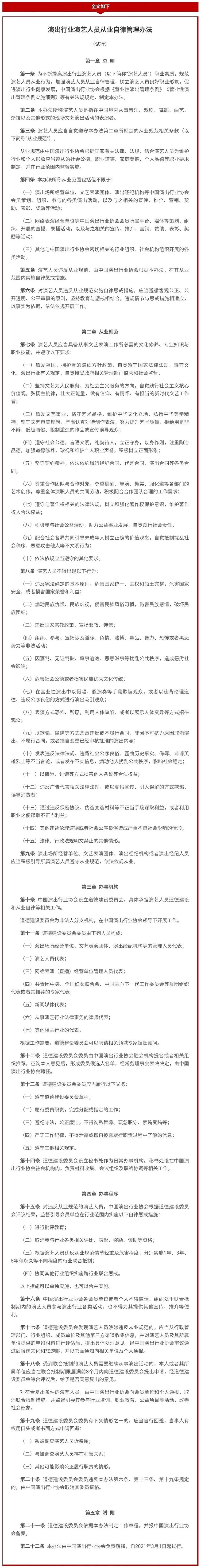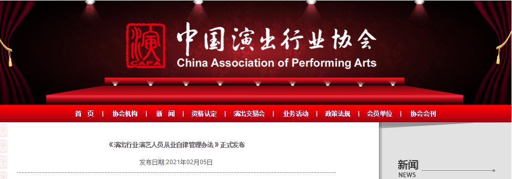 为不断提高演出行业演艺人员职业素质,规范从业行为,树立演艺人员良好职业形象,促进演出行业健康发展,在相关主管部门指导下,中国演出行业协会制定《演出行业演艺人员从业自律管理办法》(以下简称“办法”),2月5日正式对外发布,自2021年3月1日起试行。本办法首次明确规定演艺人员应当自觉遵守的从业规范,涵盖遵守社会公德、坚守契约精神、尊重合作团队与合作对象等十项义务性、责任性条款,以及十五项禁止性条款。对违反有关从业规范的演艺人员,演出行业会员单位将予以一定期限的联合抵制。依据本办法还设立道德建设委员会作为专门机构,具体承担演艺人员道德建设和从业自律等相关工作,将行业自律细化到具体操作层面。