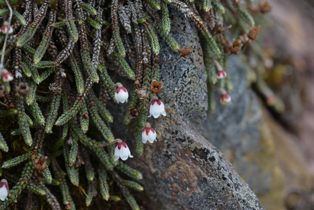 而岩氏家族的另一个远房亲戚“岩须”,则生长在远离人烟的高山之巅,海拔几乎很少低于3000米。2010 年,华南植物园从滇西北高原引进这种植物时,亲切地称之为“冰山上的来客”。岩须宛如一根根翠绿、密集的小柱子,看起来像一把倒置的扫帚,又因为它们生长时排列密集,如髯若须,被称为“岩须”。其中有些丛生,有些则铺散生长,或隐藏在杜鹃灌丛中,又或生长于裸露的岩石缝隙间。实际上,岩须的真实面貌远比名字可爱得多,其植株不过十来厘米高,枝条牢固地驻扎在石缝中,叶片紧贴着枝条表面生长,以适应高山地区的高寒气候。岩须与岩白菜一样,也是一个集体名字,属于杜鹃花科岩须属,中国植物志记载有11种,花开时节,岩须从一片片灌丛中抽出花梗,花朵似雪一样洁白,形状极似铃铛,又宛如白玉小灯笼,小巧玲珑的身影开放在高山杜鹃丛中,摇曳在雪域高原的岩石上,有一种清新脱俗的美感。