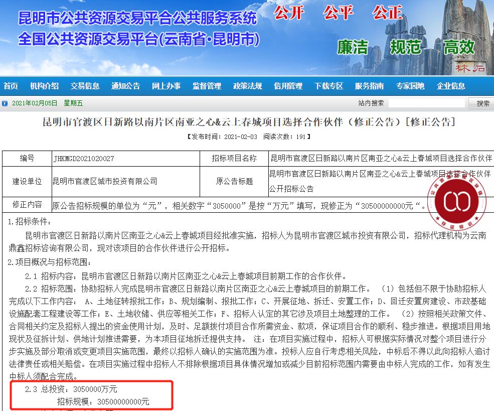 招标公告显示,项目计划于2021年3月1日开始动工,用地面积约3146亩,总投资约305亿元。计划竣工时间2026年3月1日。该项目拟以昆明市官渡区日新路以南片区(含双桥村、长村、高家村、玉龙村)三旧改造连片开发项目改造用地,作为项目用地(以下简称“项目用地”)。