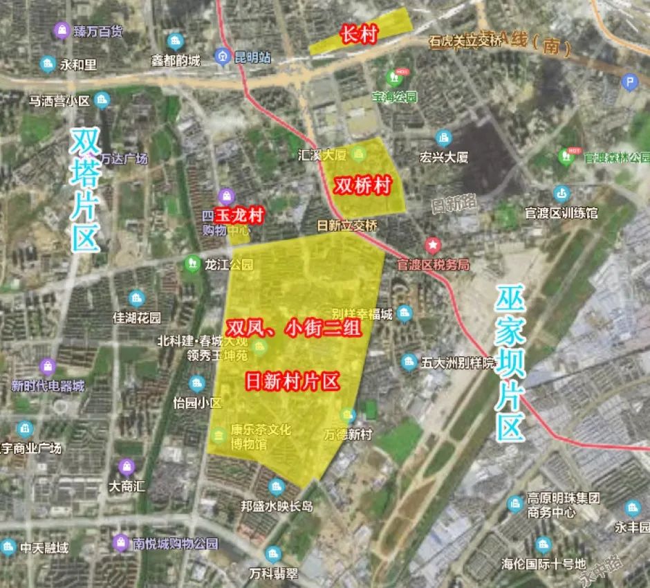 ③双凤、小街二组和日新村片区改造四至范围:北至日新路、南至玫瑰湾小区及邦盛水映长岛小区、西至盘龙江、东至枧槽河,改造用地面积2686亩;