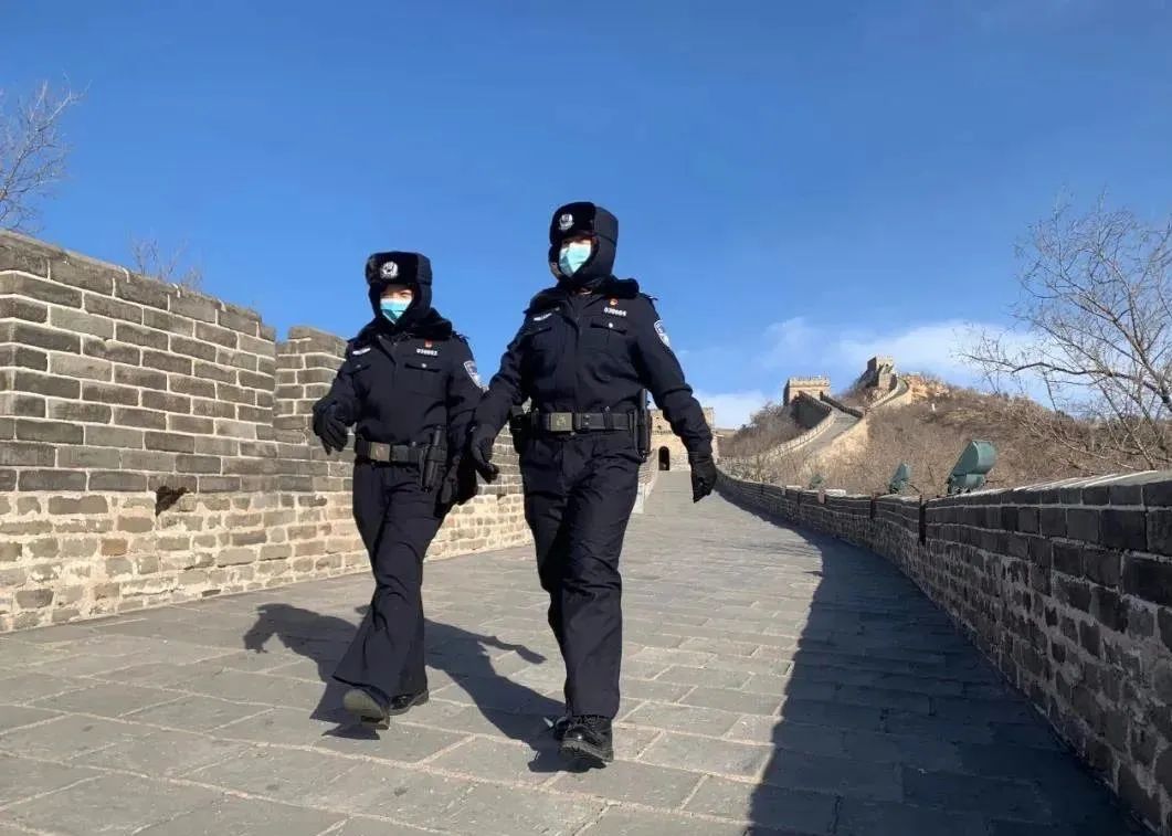 “长城卫士”、北京市公安局延庆分局八达岭派出所民警在这样的低温下,一刻没有松懈,佩戴警用装备、身着厚重执勤装在蜿蜒陡峭的长城巡逻,全力保障群众安全。