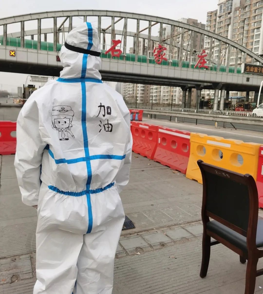 高媛白色防护服的背部,画着可爱的卡通女警,还写着“加油”二字。这简单的祝福来自同样奋战在疫情防控一线的卫生监督员张皛。