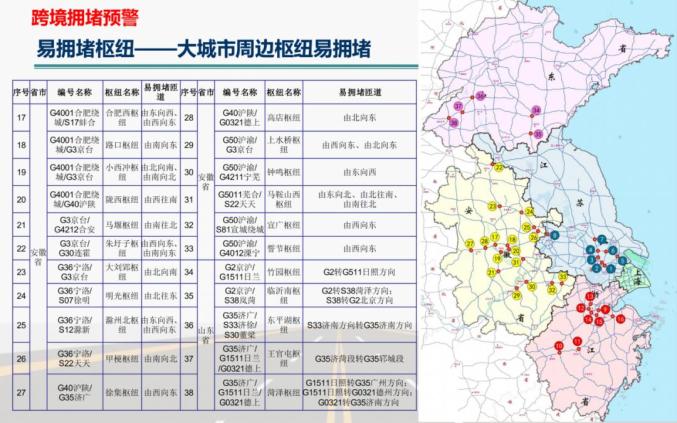 安徽境内易拥堵枢纽主要集中在:G4001合肥绕城/S17蚌合高速合肥西枢纽由东向西和由西向东方向;G4001合肥绕城/G3京台高速路口枢纽由南向东方向;G4001合肥绕城/G3京台高速小西冲枢纽由北向南、由南向北方向;G4001合肥绕城/G40沪陕高速陇西枢纽由西往南方向;G3京台/G4212合安高速马堰枢纽由南往北方向;G3京台/G30连霍高速朱圩子枢纽由西向东、由南向东方向;G36宁洛/G3京台高速大刘郢枢纽由北向南方向;G36宁洛/S07徐明高速明光枢纽由北往东方向;G36宁洛/S12滁新高速滁州北枢纽由东向西、由西向东方向;G36宁洛/S22天天高速甲梗枢纽由南向北方向;G40沪陕/G35济广高速徐集枢纽由西向东方向;G40沪陕/G0321德上高速高店枢纽由北向东方向;G50沪渝/G3京台高速上水桥枢纽由西向东、由北向东方向;G50沪渝/G4211宁芜高速钟鸣枢纽由东向西方向;G5011芜合/S22天天高速马鞍山西枢纽由东向北、由北往南、 由南往北方向;G50沪渝/S81宣城绕城高速宣广枢纽由西向东方向;G50沪渝/G4012溧宁高速誓节枢纽由西向东方向。