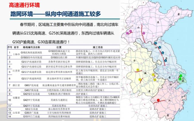 高速改扩建施工路段春节期间,区域施工主要集中在纵向中间通道,交通部门提醒:南北向过境车辆请从G15沈海高速、G25长深高速通行,东西向过境车辆请从G50沪渝高速、G30连霍高速通行。