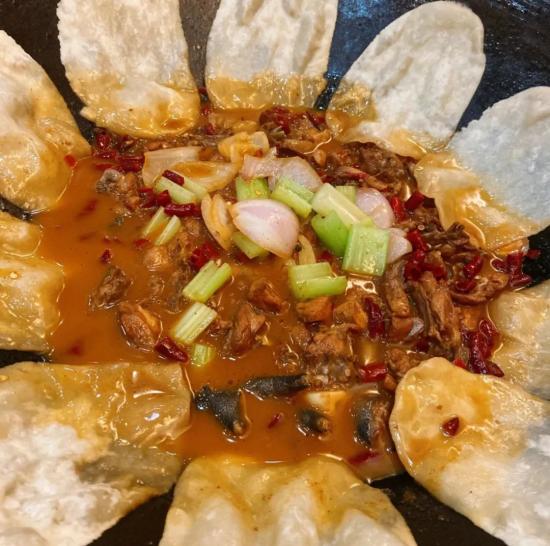 地锅鸡是一道江苏徐州的传统名菜。最初是渔民们外出必备的食物,采取泥锅下面生火上面煮菜的方式,而后按家常的做法煮上一锅菜,放入鸡肉等食材,锅边贴满面饼,味道鲜美,口齿留香,饼借菜味,菜借饼香,具有软滑与干香并存的特点。辣汤