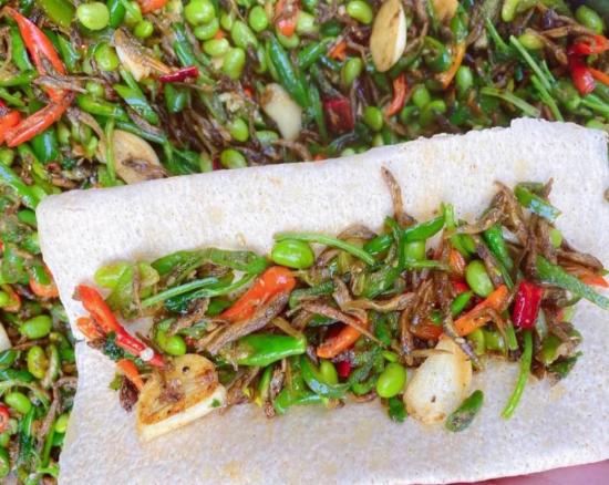 连云港人款待客人时,总离不开小鱼煎饼。这是一道富有地方特色和浓郁民间风味的点心。一张张用干面做成的煎饼有荷叶那么大, 散发着诱人的香味, 既薄且微脆,却又富有韧性。煎饼中间卷入青椒小鱼,咬上一口,满口清香,五味俱全。花果山风鹅