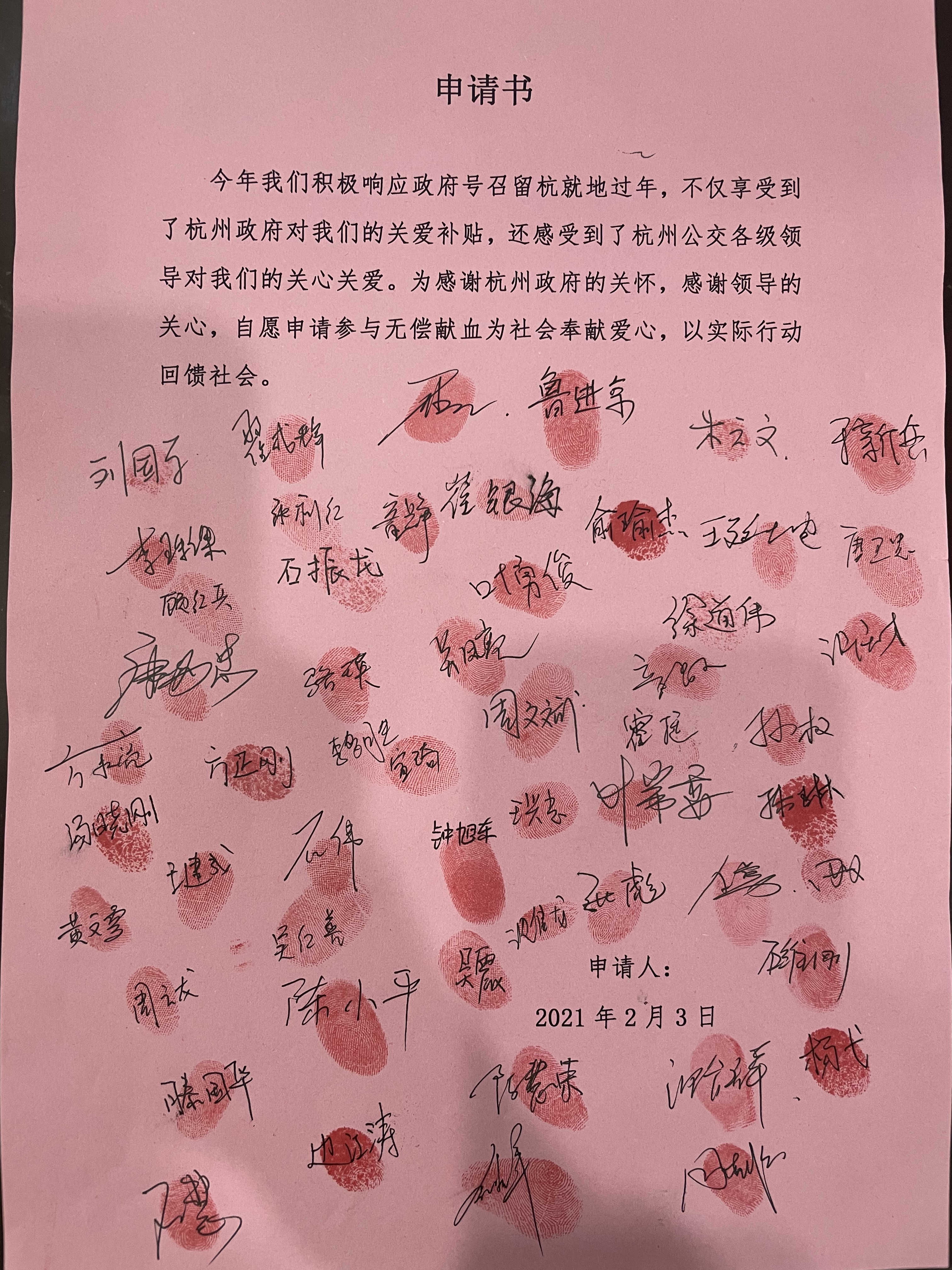 “本来想做点公益,但由于工作的原因,时间安排不开,就想到了献血。”李珠课告诉澎湃新闻,他将这个想法告诉了身边就地过年的公交司机,得到了积极的响应。于是留杭的公交司机们一起写了份献血申请书,并按下了自己的手印。