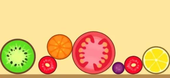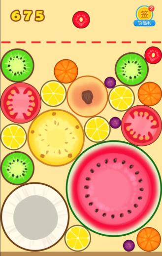 游戏由很多不同类型、大小的水果组成。游戏开始时,上面会随机出现不同的水果,你要做的就是选择一条纵坐标将这个水果扔下去,相同的水果接触后会互相解除,然后会变成更大的一种新水果,以此类推,最大的水果就是“大西瓜”了。