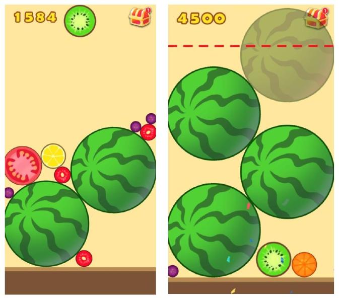 这种操作,是不是很像《俄罗斯方块》,相互消除的机制又很像《2048》。虽然操作很简单,不过你千万不要以为得高分很容易,一般的玩家,基本上只能合成一个大西瓜,两个就已经非常难得了,三个就是妥妥的高玩了。