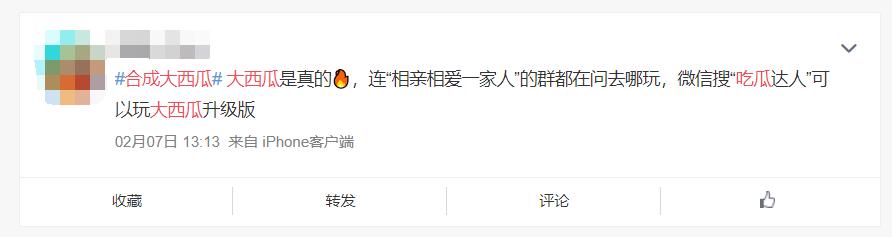 除了简单易上手之外,H5小游戏的基因,也为大范围传播奠定了基础。游戏操作简单,但是如果涉及到下载APP、安装、注册、更新版本这些传统游戏的步骤,那对于不太喜欢折腾的用户就不友好了。《合成大西瓜》的H5可以直接在微信里打开,链接分享也很容易,在微信内就能完成玩、分享、晒朋友圈的全部操作。国人的智能手机里,没装微信的还有几个?就连70岁的老大爷微信都玩的飞起。