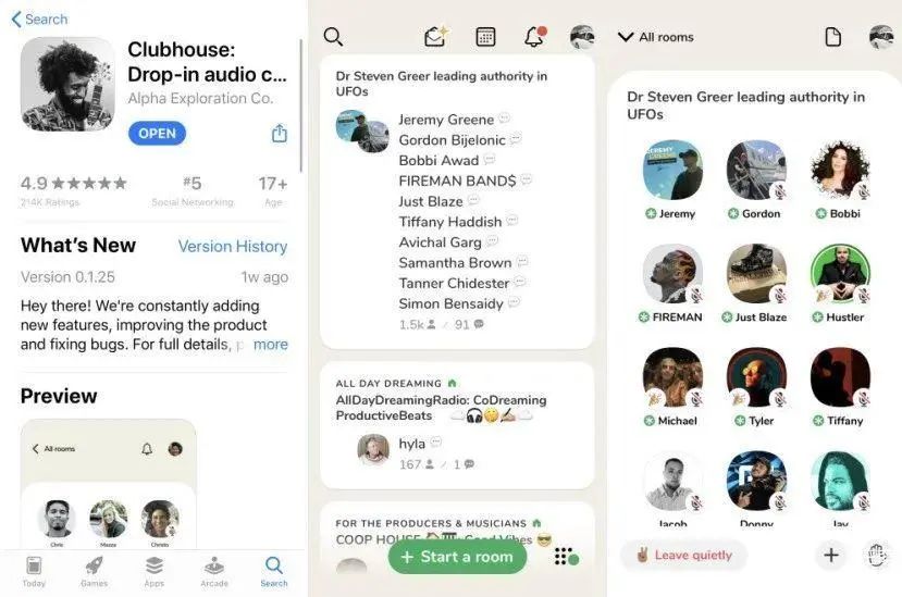 图|Clubhouse在Apple Store介绍页面它以语音聊天室为主要形式,内部又分为主持人、嘉宾和听众三种角色。整个APP包含不同的聊天室,每一个聊天室的人数少可以数位,多则可上千。