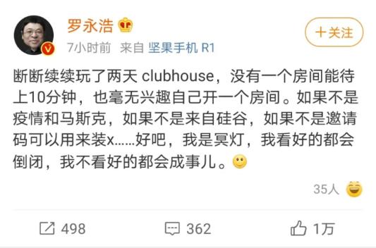 图|罗永浩发微博吐槽Clubhose一位用户说,可能之前你觉得永远没机会交流的人,现在出现在面前就能瞬间交流。