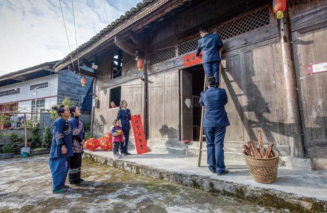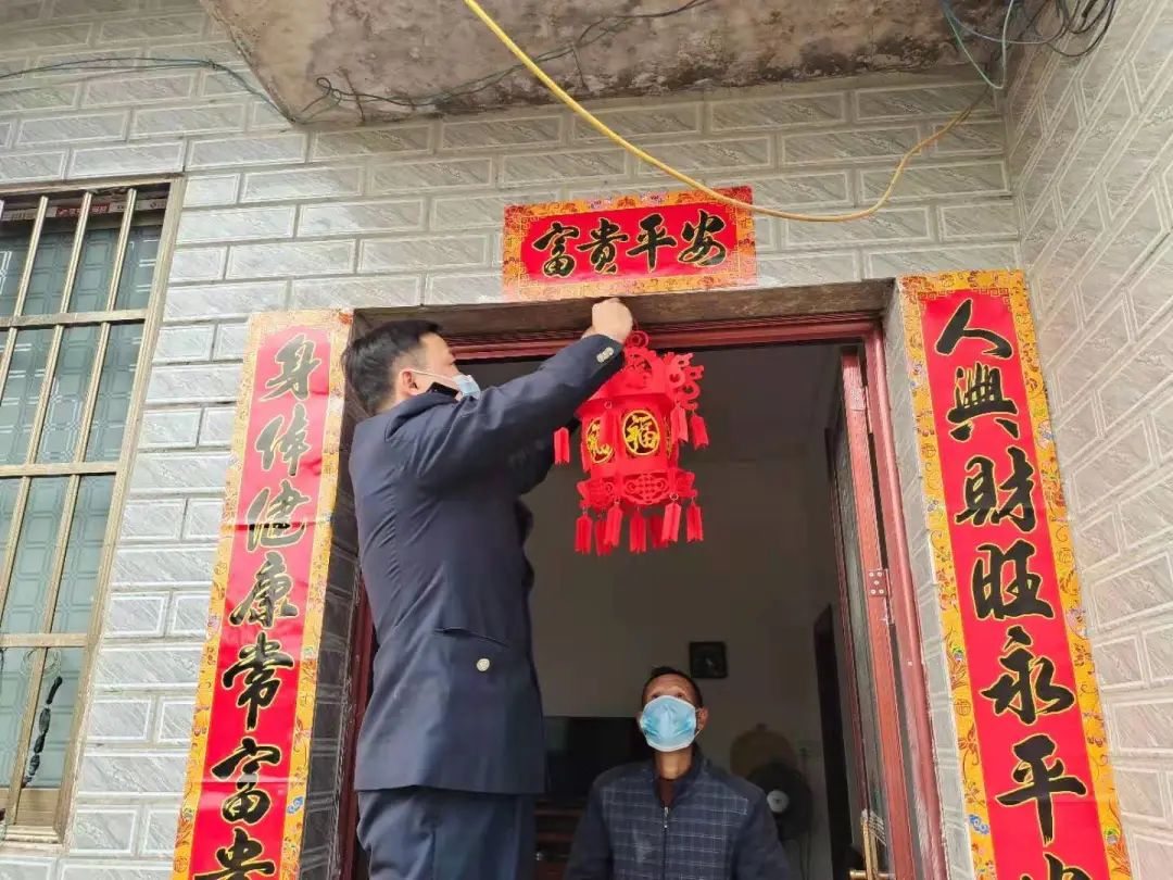 在广西,国家税务总局桂林市临桂区税务局干部来到定点帮扶的两江镇贺村,为贫困户送上春节慰问和新春祝福。图为税务干部帮助腿脚不便的脱贫户贴春联、挂灯笼,迎接新年的到来。(李倩茹/摄)