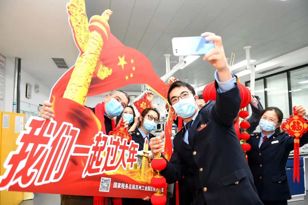 在江苏,税务部门联合企业开展“我们一起过大年”迎新春活动,用税惠红利和真情服务,全心全意助力企业稳岗留工。图为国家税务总局苏州工业园区税务局干部来到维苏威高级陶瓷(中国)有限公司,与奥地利籍总裁高翰思(左一)带领的员工团队一起举办活动,并送上新春祝福。(孙军/摄)
