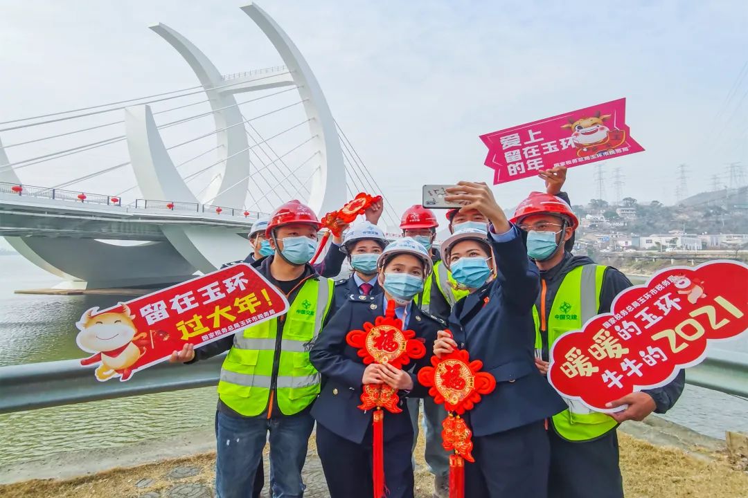 在浙江,国家税务总局玉环市税务局来到当地企业开展走访慰问活动。图为税务干部在中交二公司玉环漩门湾大桥项目部和工人合影留念。(章泸月/摄)