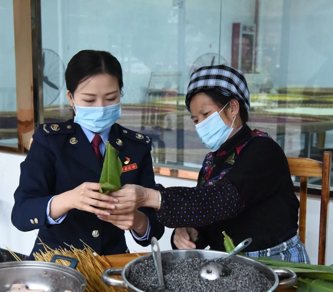 在贵州,“包粽粑”是册亨县纳贤村的传统年俗。图为国家税务总局册亨县税务局驻村干部与布依阿妈一起包粽粑,庆新年 。(叶星婵/摄)